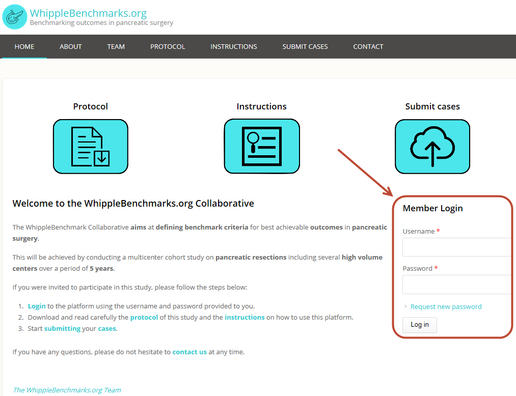 - Login to the website to access all necessary study documents and submit your cases online. To do so, please type in your username and password at the "Member Login" menu available at the ride-side bar of the website (see image below) or simply use the following link: https://WhippleBenchmarks.org/user