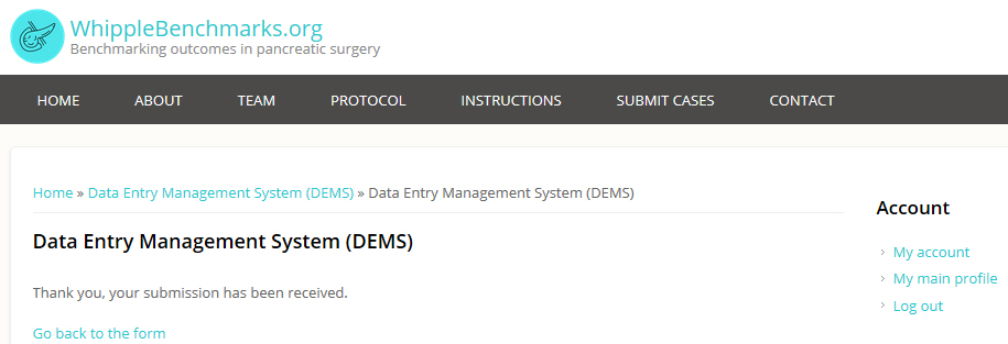 - The Data Entry Management System (DEMS) consists of a simple electronic form that you may fill in the data for each case (see image below). Please ensure to complete as much information as possible / available. The DEMS can be also accessed directly using the following link: https://www.WhippleBenchmarks.org/DEMS