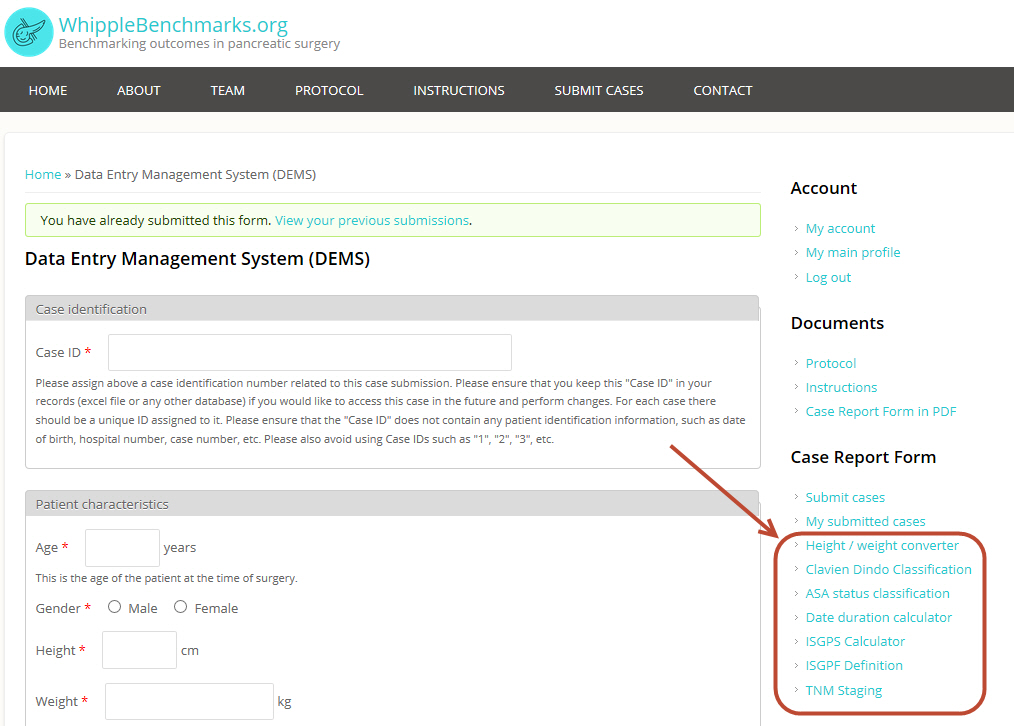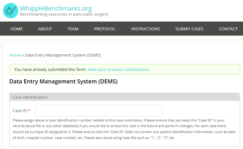 - If for any reason you would like to access the list of your previous case submissions, please click on the “View your previous submissions.” link available on the top of the form as shown below. Alternatively, you may access your previous submissions by clicking on the "My submitted cases" available on the right side-bar of the platform or by simply following the link below https://www.whipplebenchmarks.org/node/8/submissions.