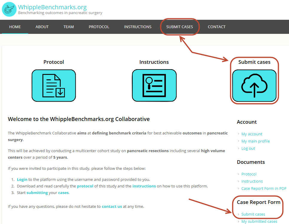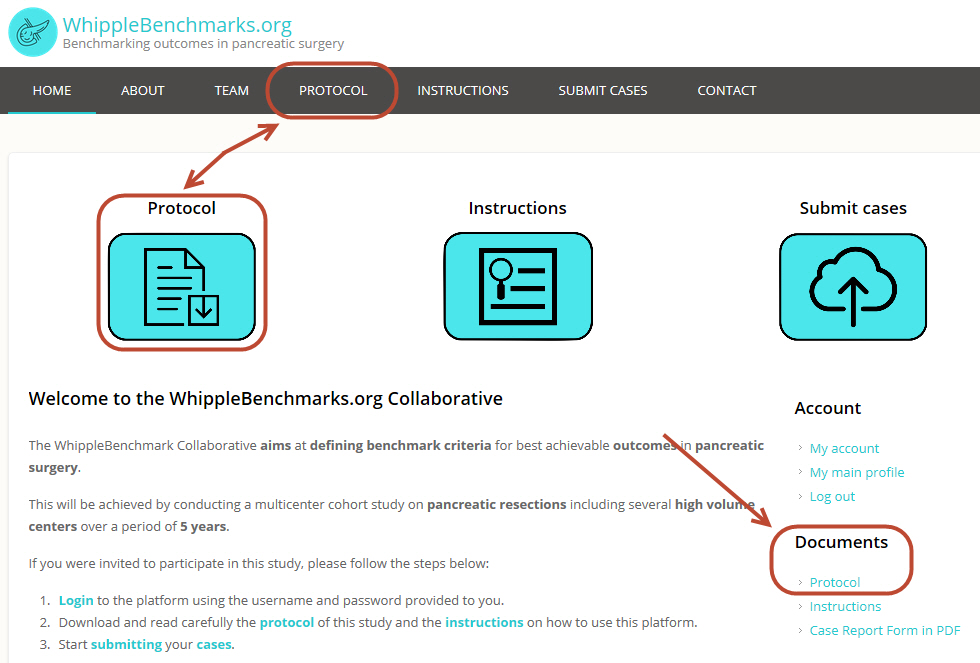 - Please ensure that you have carefully read the study protocol before attempting entering cases at our Data Entry Management System (DEMS). To do so, please click on the “Protocol” icon shown as shown below. The link to the protocol is also available on the main menu and right side bar of the website in all pages. Alternatively you may directly access the study protocol using the following link: https://www.WhippleBenchmarks.org/protocol