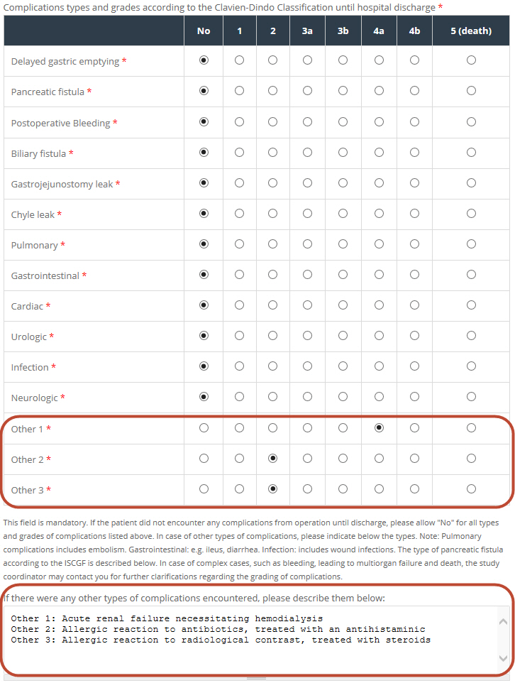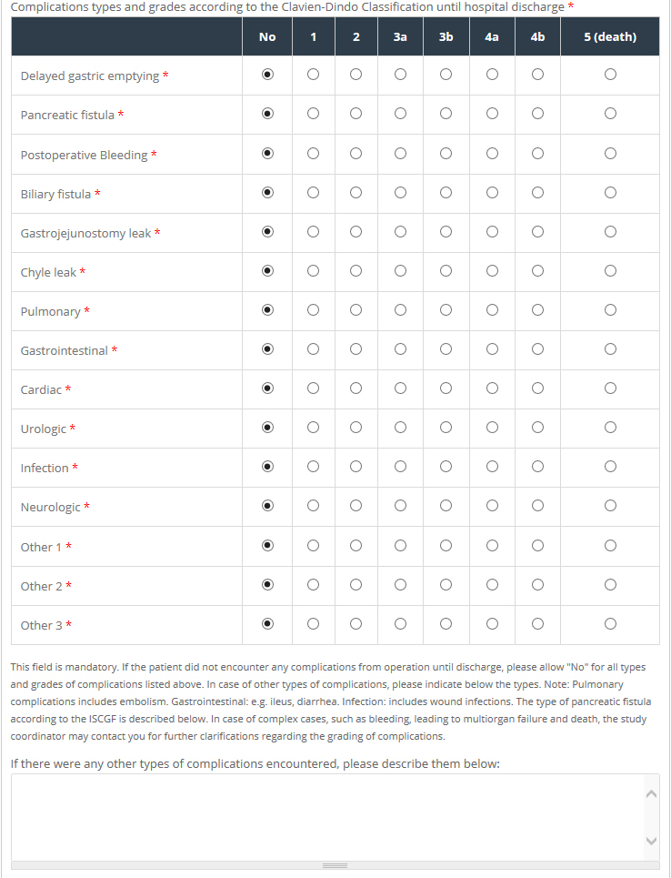 An other important mandatory field is the “Complications types and grades according to the Clavien-Dindo Classification from operation until discharge*” under the section “Postoperative course from operation until discharge”.